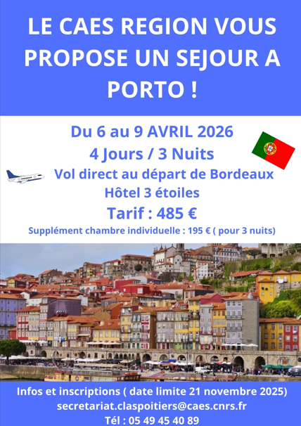Le CAES Région vous propose un séjour à Porto du 6 au 9 avril 2026, 4 jours et 3 nuits.